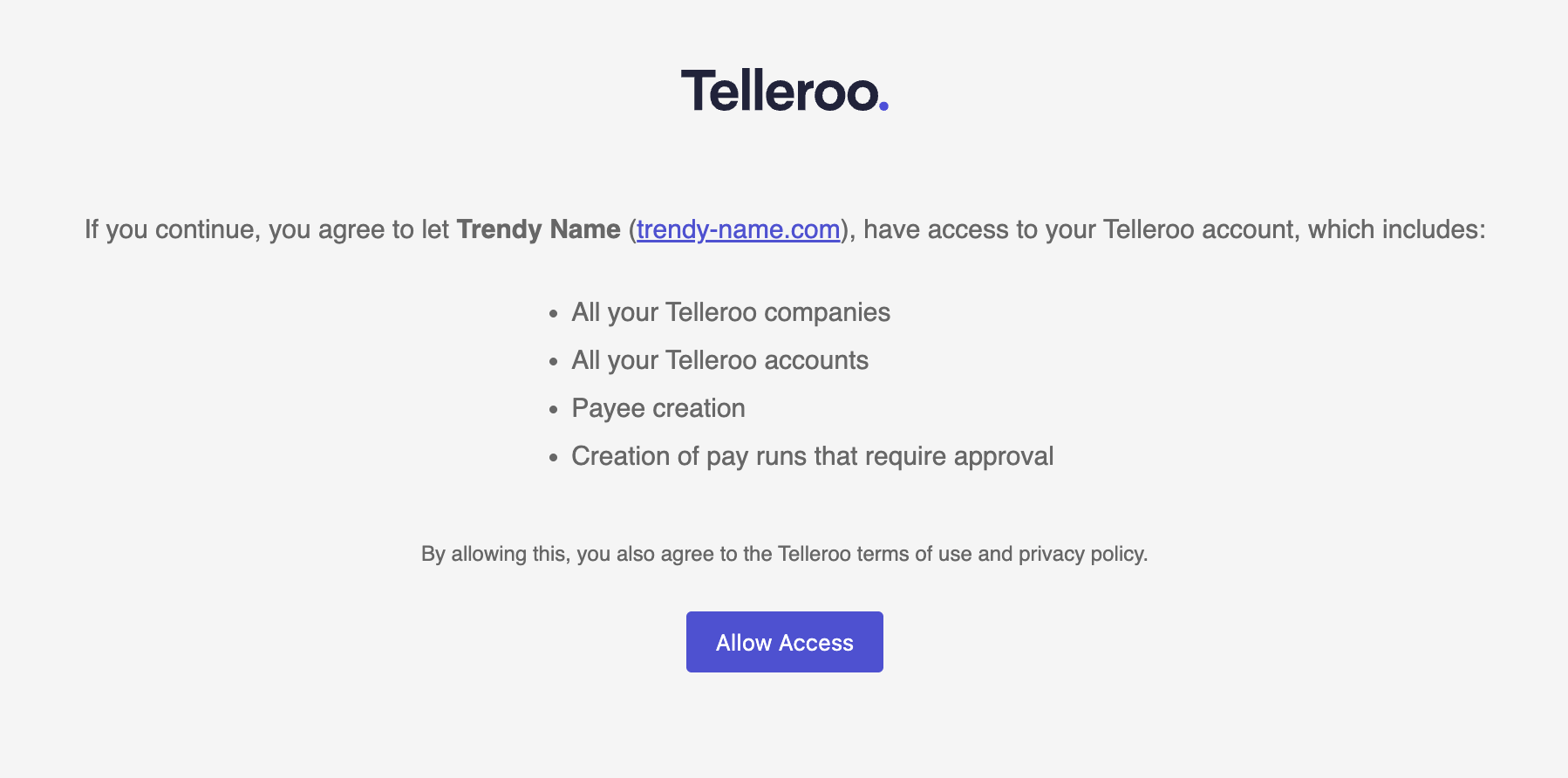 Welcome to the Telleroo Partner API documentation. This documentation provides you a step by step guide on connecting your application to Telleroo using OAuth 2.0. Once connected you will be able to create payees and draft pay runs on behalf of companies/accountants once they've granted you permission.